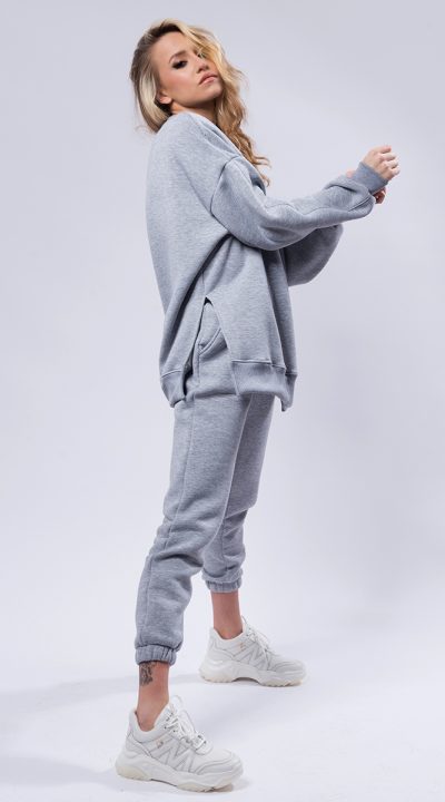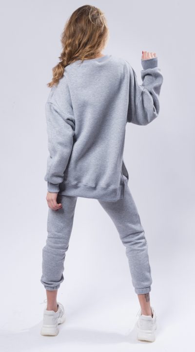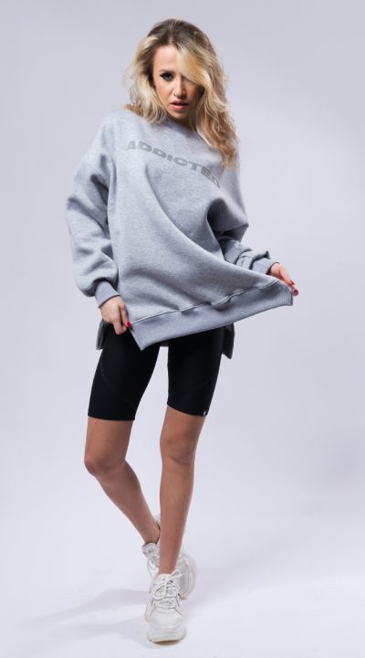 Дамски суичър без качулка изработен в сив цвят от мека ватирана памучна материя.Свободна кройка, обло деколте, паднали ръкави и малки цепки от двете страни.Брандиран със светлоотразително лого в предната част.