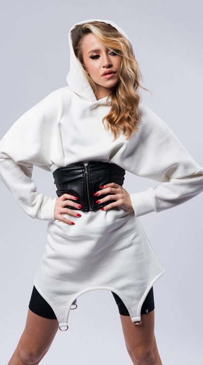 Дамско ватирано худи-рокля, изработено от изключително мека ватирана материя в бял цвят.С вталена кройка, метални акценти и качулка.Много удобно и подходящо облекло за ежедневие с което няма да останете не забелязана.