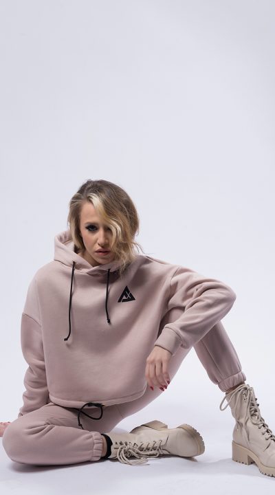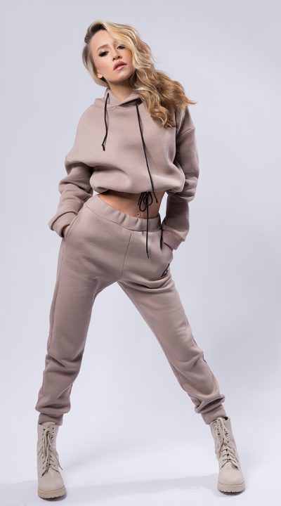 Горната част е кроп суитчер със свободна кройка и връзки в долната част и на качулката.Долната част е панталон с джобове и ластик в долната част на крачолите.Спортния комплект е с акцент дискретно лого.