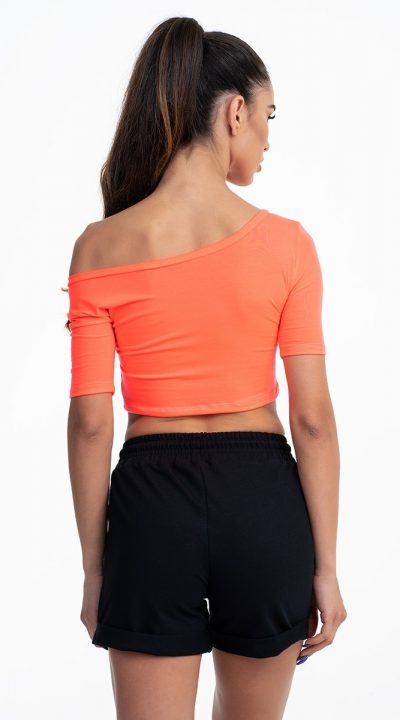 Дамски къс топ от мека памучна материя с ефектно лого в предната част и деколте тип лодка.