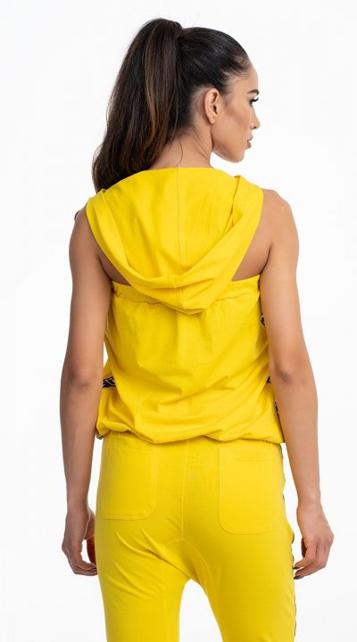 Топ с атрактивна кройка изработен от мек памучен плат.Качулка, голям джоб в предната част и брандирана лента от двете му стани го правят удобен и предпочитан за свободното време.